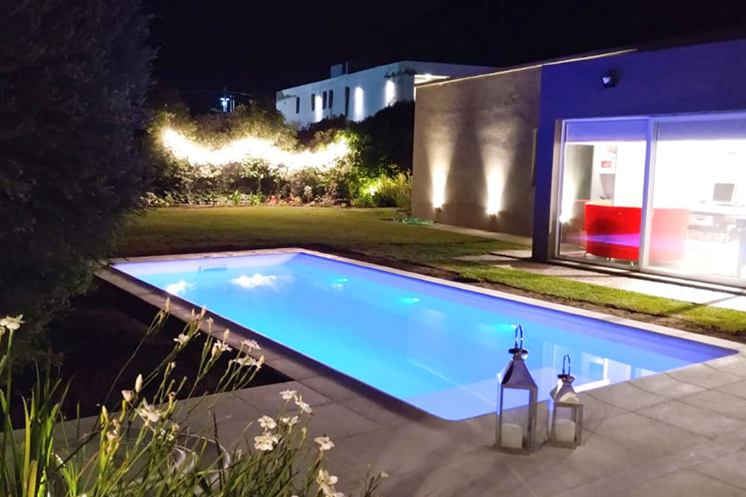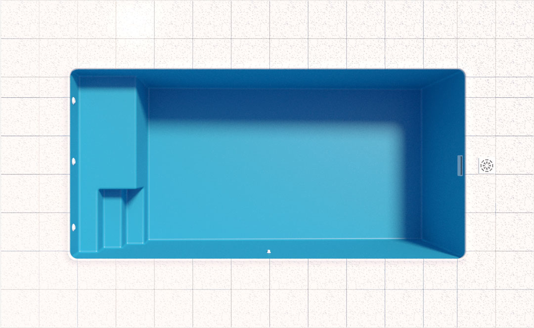 Diseño rectangular que incorpora playa húmeda y escalinata. Ideal para tomar sol mientras disfruta de una exclusiva piscina ACQUAM.